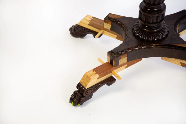 Không dừng lại ở việc phục hồi, Kobayashi còn "mở bung" các bộ phận của chiếc tủ, biến nó thành một chiếc bàn. ‘Tôi muốn nó nở ra như một bông hoa – thành hình dạng mới từ ký ức cũ.’ Dưới chân bàn, anh điểm xuyết những vệt sơn xanh – như một biểu tượng khiêm nhường của sự sinh sôi.