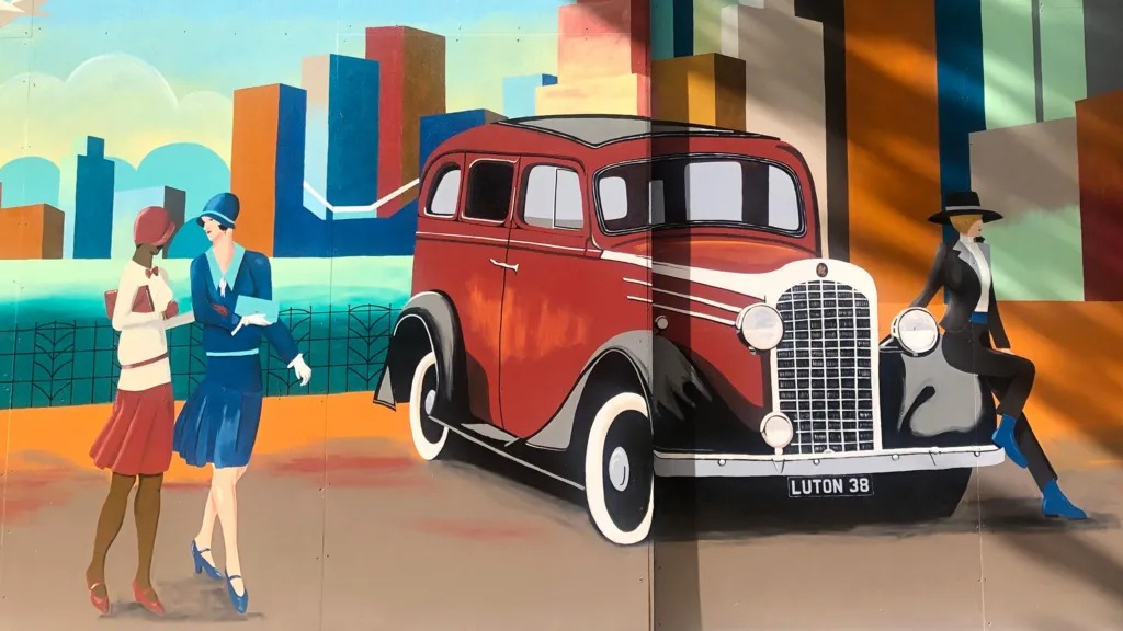 Bức tranh tường sống động này tái hiện một chiếc xe hơi Vauxhall, một chiếc máy bay và nhiều nhân vật đội mũ - tất cả đều gắn liền với các ngành công nghiệp đặc trưng của Luton.