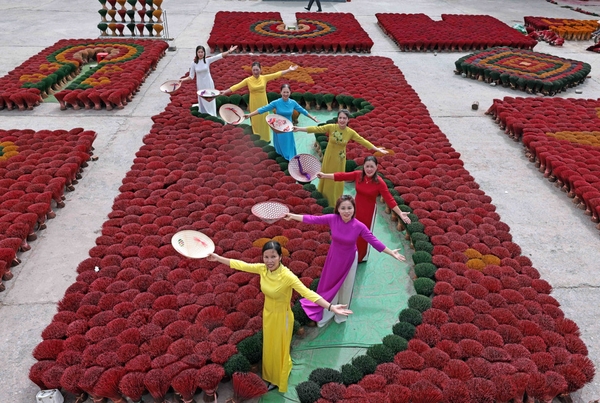 Vào dịp giáp Tết, làng nghề tăm hương Quảng Phú Cầu nhộn nhịp đón nhiều đoàn khách quốc tế. Từ người lớn tuổi đến trẻ nhỏ, ai cũng thích thú tạo dáng bên những bó tăm hương mộc mạc, rực rỡ sắc màu – một vẻ đẹp rất đỗi bình dị mà cuốn hút.