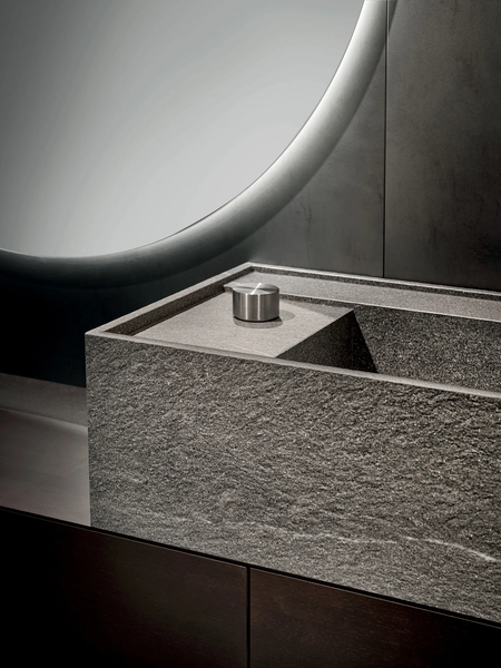Sự kết hợp giữa tay nghề mộc tinh xảo của Falper và kỹ thuật gốm sứ cao cấp của Florim tạo nên “Elitique”. Bộ sưu tập mở đầu với hai dòng của Matteo Nunziati và Victor Vasiev, mang đến nhiều tùy chọn hình thức và hoàn thiện bề mặt. Nổi bật là mẫu bồn rửa tối giản bằng đá sứ Titanium Flame Dark kết hợp cùng tủ gỗ chế tác riêng.