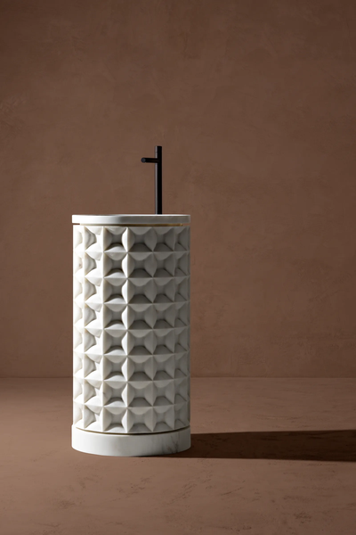Tiếp nối hành trình thử nghiệm trang trí đá cẩm thạch ba chiều, Christophe Pillet tạo nên “Dawn” – bồn rửa đứng như khối điêu khắc. Đá cẩm thạch được đục thủ công, hình thành các nếp gấp mềm mại như vỏ sò. Thiết kế có nhiều lựa chọn từ đen Nero Marquina đến các sắc trắng tinh tế như Carrara. Pillet đồng thời sáng tạo loạt bình hoa cùng phong cách.