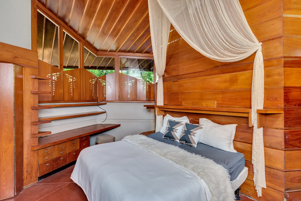 Khác biệt với các công trình kiến trúc truyền thống, ngôi nhà không sử dụng khung vách thông thường, gạch, sơn hay gạch men. Toàn bộ trần và tường được chế tác từ gỗ đỏ Heart Tidewater Cypress quý hiếm, mang lại cảm giác ấm áp và sang trọng tự nhiên. Những ô cửa kính lớn từ sàn đến trần giúp mở rộng tầm nhìn ra khu vườn, kết nối liền mạch giữa không gian nhà bên trong và cảnh quan xung quanh.
