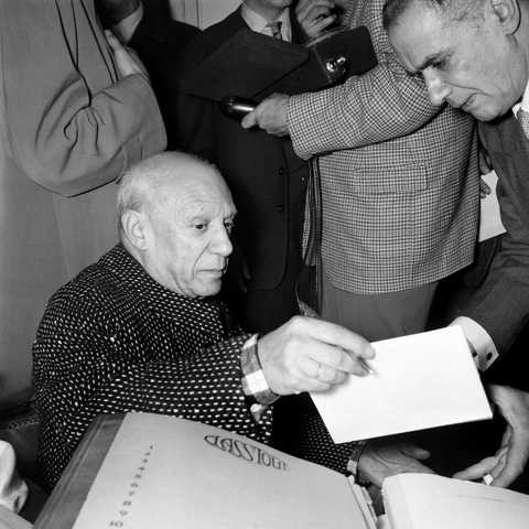 ( Pablo Picasso signs autographs on December 24, 1956 at the opening of an exhibition )