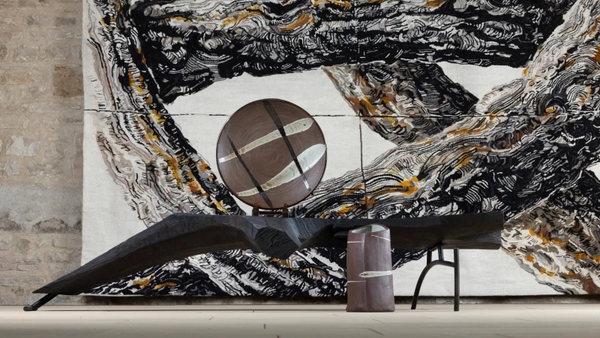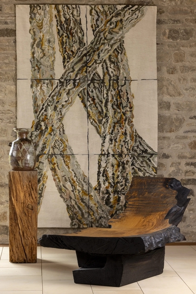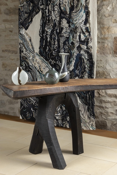 Bên cạnh các tác phẩm dệt, Thorns Gallery còn trưng bày loạt đồ nội thất điêu khắc của Simon Gaiger – người thợ gỗ làm việc tại xưởng ngoài trời ở xứ Wales. Từ gỗ sồi, sắt rèn và các loại gỗ tự nhiên, Gaiger tạo ra những chiếc bàn, ghế có hình khối đầy ẩn dụ, phản ánh ký ức về biển cả, huyền thoại và tuổi thơ ở Uganda, Sudan. Những chi tiết như chân bàn thép uốn cong gợi hình gai, hay mặt bàn dạng "boomerang" lấy cảm hứng từ khung trưng bày bảo tàng – vừa thô mộc, vừa giàu tính hình tượng.