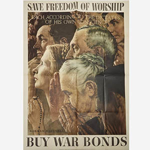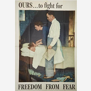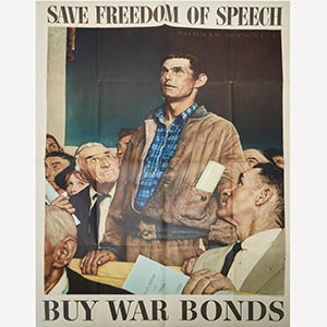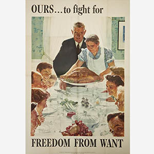 Phía trên: Norman Rockwell, bốn tấm áp phích Tự do: Tự do khỏi Thiếu thốn, Tự do khỏi Sợ hãi, Tự do khỏi Thờ cúng và Tự do Ngôn luận, 1943.