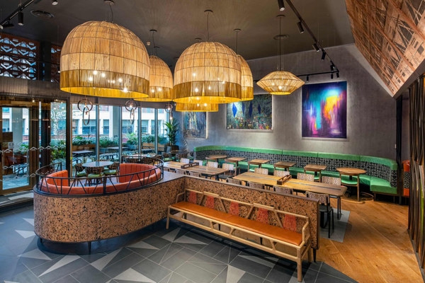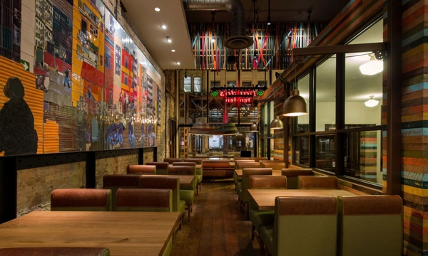 Tác phẩm Construction Workers của Sam Nhlengethwa tại chi nhánh Nando’s trên đường Wabash, Chicago. Ảnh: Spier Arts Trust cho Bộ sưu tập Nghệ thuật Nando’s.