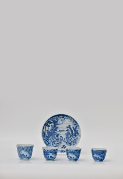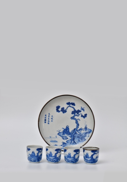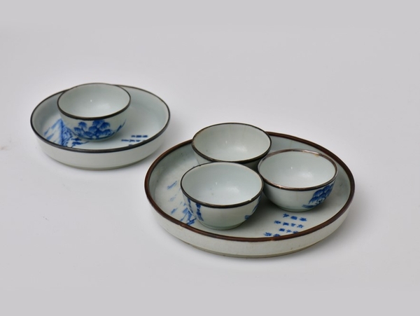 Bộ trà kiểu Huế với một tống – ba quân, thuộc dòng Xuân – Thu ẩm, trang trí đề tài sơn thủy, đồ ký kiểu Minh Mạng.