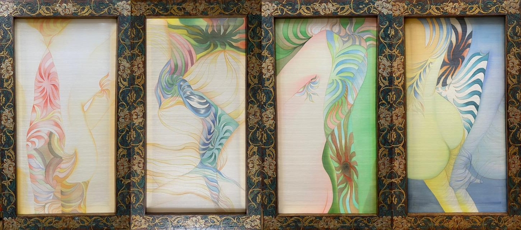 Chất liệu: Màu nước trên lụa, sơn mài