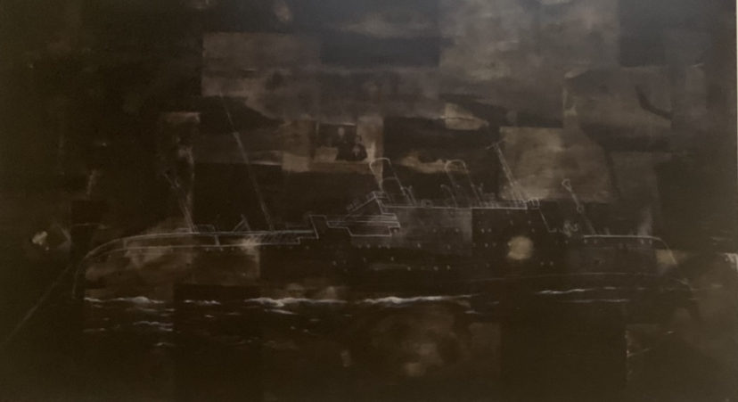 Hình ảnh con tàu nghiêng vì vậy không chỉ là một khung cảnh—nó là một căng thẳng hiện hình, là biên giới giữa thế giới con người và thế giới phi nhân loại. Những đường phấn trắng gợi cảm giác chưa hoàn tất, trong khi nền đen đặc quánh lại như màn đêm phủ lên biển khơi, mang đến cảm giác trọn vẹn kỳ lạ. Con tàu ấy, trong sự lệch lạc của nó, không chỉ trôi giữa sóng nước mà còn giữa những câu hỏi chưa lời giải.