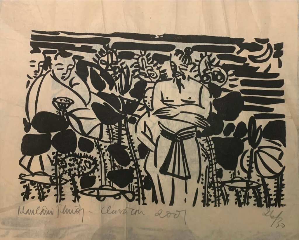 Tranh in khắc gỗ mực than lá tre trên giấy dó "Cha và con" (26/30) - Phan Cẩm Thượng