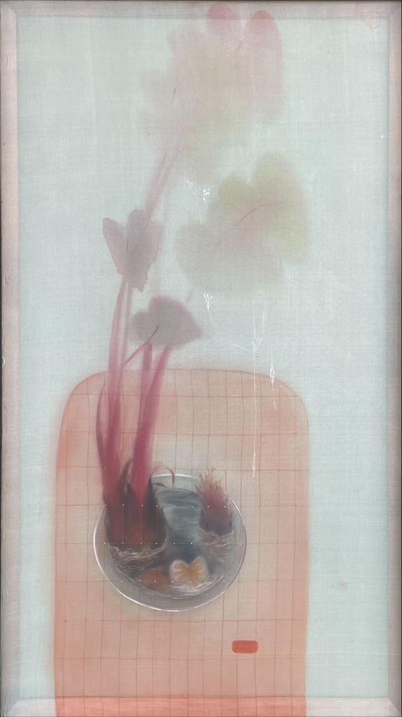 Điểm nhấn của bức tranh lụa này là thân cây màu đỏ tím, chuyển dần từ sắc đỏ đậm ở gốc đến màu nhạt dần về phần lá, hòa quyện vào nền trắng đục, tạo nên một cảm giác vừa rực rỡ vừa thanh thoát.