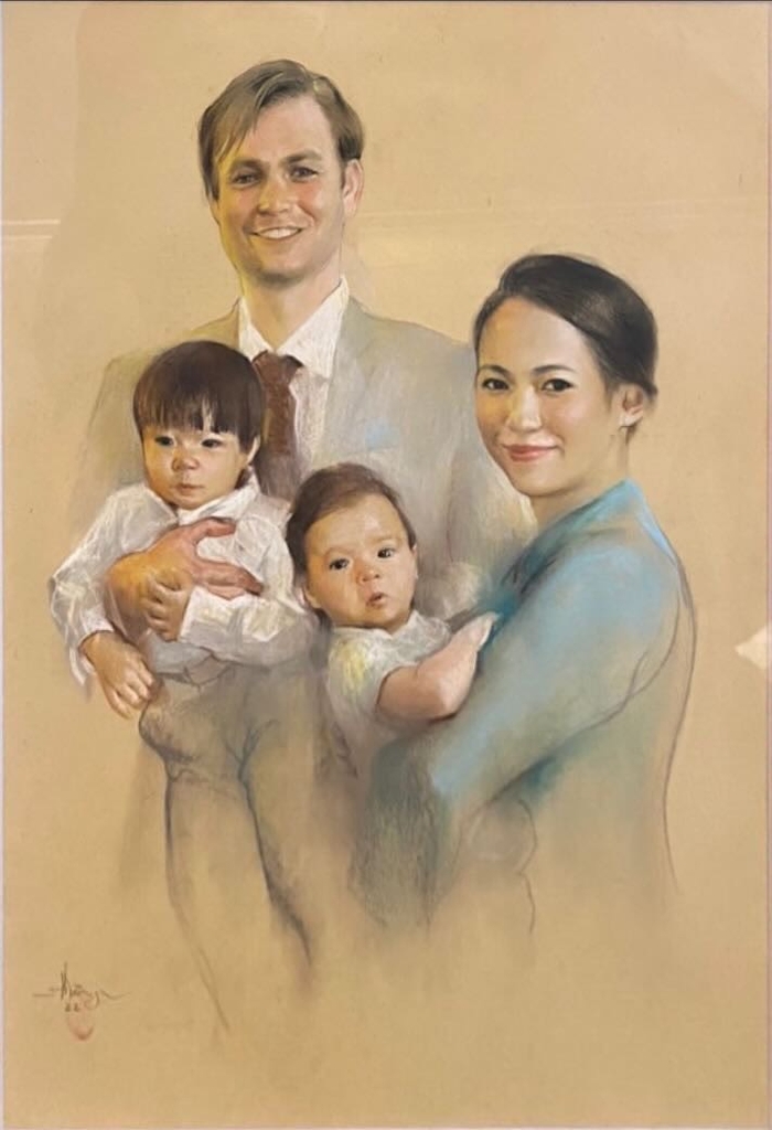 Tranh phấn “ Chân dung gia đình Nhất Hạnh và Jonas Ringstard” - Hoạ sĩ Chu Thăng