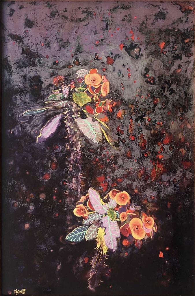 Đây là hai tác phẩm “Gốc” và “Ngọn” của họa sỹ Vũ Văn Tịch, là trích đoạn nhỏ của cuộc triển lãm sơn mài mà anh ấp ủ trong 3 năm, và sắp diễn ra vào cuối năm 2022. Những người quan tâm đến chất liệu sơn mài hẳn đã biết về độ phức tạp và đòi hỏi thời gian dài của việc thực hiện một tác phẩm sơn mài: Từ thời gian ủ ẩm của từng lớp, đến vẽ bằng mài, hay cách sử dụng sơn ta, vàng, bạc, trai, trứng… để tạo ra các hiệu ứng và cảm giác khác nhau trên bề mặt tranh. Sơn mài từ một chất liệu truyền thống, khi được chuyển vào trường đào tạo nghệ thuật từ những năm đầu thế kỷ, đến nay đã có nhiều thay đổi. Văn Tịch cũng là một trong các họa sỹ trẻ đóng góp vào dòng chảy của việc phát triển ứng dụng lên sơn mài từ vài chục chất liệu, lên hàng trăm chất liệu với các chủ đề cả giản dị và đổi mới.