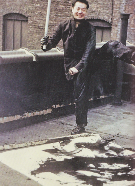 Walasse Ting đang vẽ tranh trên mái nhà xưởng vẽ của mình ở New York.