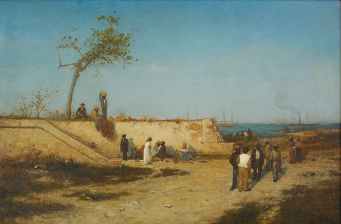 Các yếu tố từ ba tác phẩm trên được kết hợp trong một bức tranh hiếm có có niên đại, "Người bán trái cây dưới bức tường biển tại Nassau, New Providence", nơi Tiffany đưa chúng ta trở lại chuyến du ngoạn của mình, lần này là đến Bahamas. Dưới bầu trời xanh rộng lớn theo phong cách Luminist và bên cạnh bức tường và cầu thang đổ nát, cảnh vật gợi nhớ đến Cựu Thế giới hoặc ít nhất là phong cảnh Trung Đông, như Bodrum, Thổ Nhĩ Kỳ, đã truyền cảm hứng cho ông. Bố cục của bức tranh năm 1870 có sự cân bằng cổ điển, hàn lâm, với cây cong trên đỉnh tường ở phía trên bên trái cân bằng nhóm đàn ông ở phía dưới bên phải. Cầu thang lặp lại bức tường bị vỡ và hình tam giác tán lá ở phía dưới bên trái cân bằng hình dạng của nước ở giữa bên phải. Người Bahamas thể hiện chủ nghĩa lãng mạn vùng Caribe qua trang phục của người phụ nữ ngồi dựa vào tường, nhìn ra người xem. Ánh sáng trên tường cho phép Tiffany khắc họa đường viền và bóng của mọi người mà không cần phải xác định chúng một cách thực tế, như trong bức tranh "Pyramids at Giza". Cuối cùng, đây là những người đang bận rộn với công việc thường ngày, như trong bức tranh "Pushing Off the Boat, Sea Bright, New Jersey".