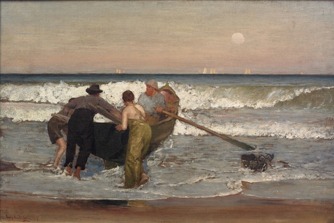 Bức tranh "Pushing Off the Boat, Sea Bright, New Jersey" cho thấy Tiffany có thể đã bị ảnh hưởng bởi Winslow Homer và những hoạ sĩ khác, những người sau Nội chiến đã từ bỏ chủ nghĩa anh hùng để tìm kiếm sự kịch tính trong cuộc sống thường ngày của người dân. Trong bức tranh này, ba người đàn ông đang cố gắng đưa thuyền ra khỏi sóng, trong khi một người thủy thủ chờ để chèo khi thuyền đã ra xa. Những cánh buồm ở xa cho thấy có nhiều thuyền đã ở trên biển, và mặt trời đã lên cao, phản ánh những hình ảnh hơi muộn vào buổi sáng. Các dải ngang đặc trưng của phong cách Luminist tạo thành bối cảnh cho hành động, với Tiffany tiếp tục tìm kiếm chất lượng ánh sáng khi mặt trời vẫn chưa làm tan sương mù đêm.