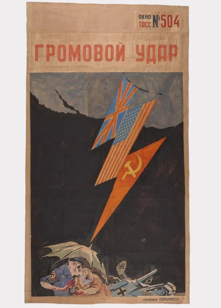 Không thể thiếu trong triển lãm là các tranh cổ động thời chiến, một chủ đề mang tính kết nối với bối cảnh hiện tại. Một poster của nhóm nghệ sĩ Kukryniksy mô tả tia sét từ ba lá cờ Liên Xô, Mỹ và Anh đánh thẳng vào Hitler và Mussolini, thể hiện sự đoàn kết chống phát xít. Những tài liệu này vừa được tìm thấy và phục chế từ kho lưu trữ của bảo tàng.