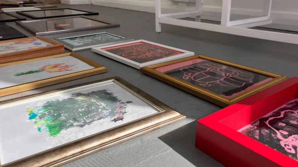 Tác phẩm nghệ thuật sẵn sàng được trưng bày trên tường của Phòng trưng bày 142, một không gian nghệ thuật pop-up do nghệ sĩ điều hành ở trung tâm Felixstowe