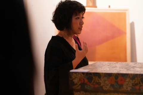 Giám tuyển bộ sưu tập Vân Vi chia sẻ trong buổi khai mạc "Trong dòng chảy của lụa 2025"
