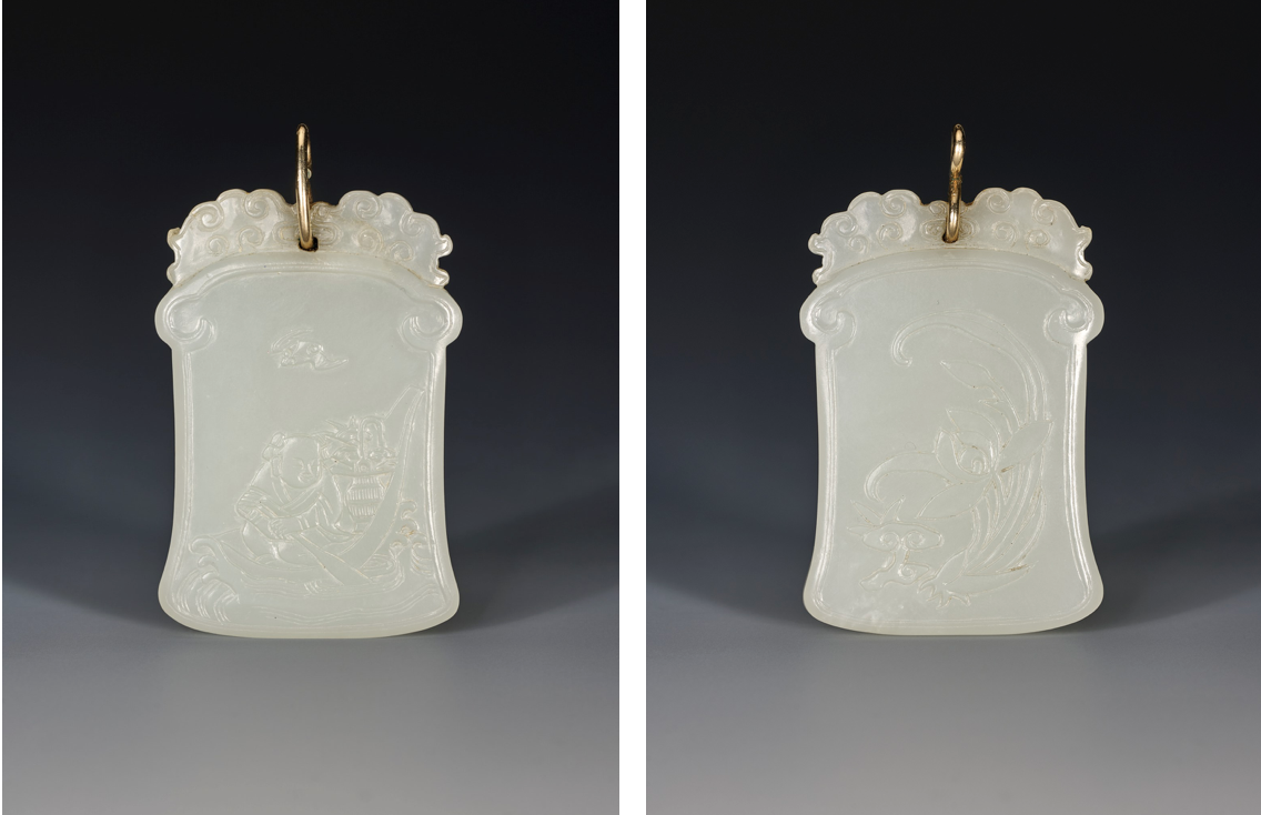 Một tấm bảng chạm khắc hình ảnh “cậu bé và con dơi” bằng ngọc trắng, thế kỷ 18-19.