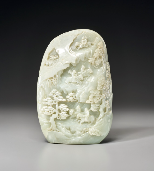 Một tảng đá lớn bằng ngọc trắng được chạm khắc tinh xảo có hình ảnh 'thợ săn cưỡi ngựa', thế kỷ 18
