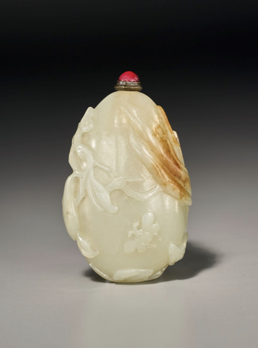 A well-carved pale greyish-white jade eggplant-form snuff bottle, 1750-1830.