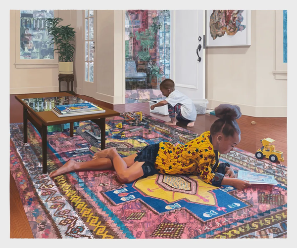 Njideka Akunyili Crosby, (Na Parlour) (tạm dịch: In the Parlor), 2025. Tư liệu: © Njideka Akunyili Crosby. Được cung cấp bởi nghệ sĩ, Victoria Miro và David Zwirner. Ảnh: Marten Elder.