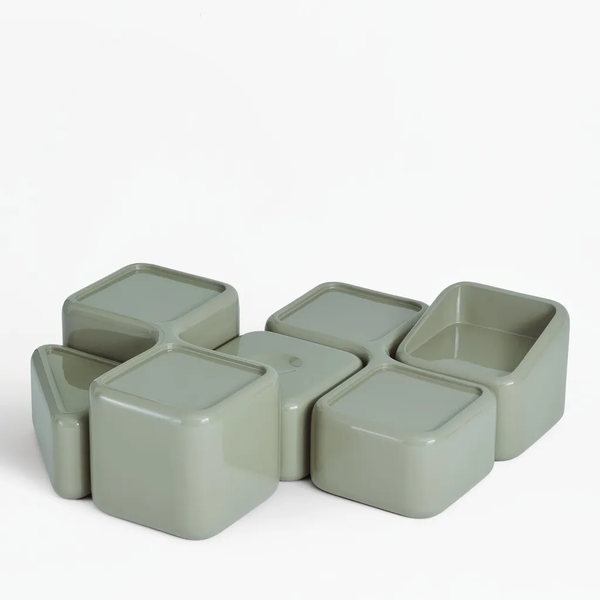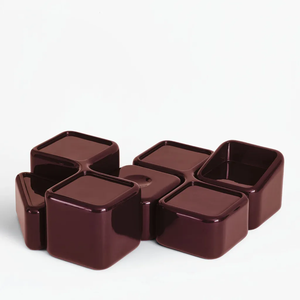 Đúng như tên gọi, bàn trà Module gồm nhiều khối hộp bo tròn có thể sắp đặt tự do theo nhu cầu sử dụng và diện tích không gian. Mỗi khối lại mang một hình dáng riêng: hộp để sách, kệ nổi từ mép không đối xứng, hay khối tam giác thấp để đặt cốc hoặc bình hoa. Sản phẩm được làm từ sợi thủy tinh đúc với lớp sơn bóng cao cấp, đặc biệt nổi bật trong sắc đỏ thẫm và xanh bạc hà.