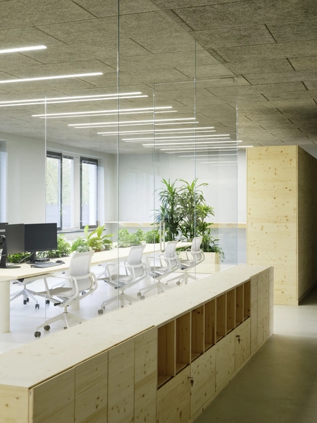 Với diện tích gần 500m², văn phòng được tổ chức thành ba vùng chức năng chính, mỗi khu vực là một "bối cảnh làm việc" khác nhau: từ bàn làm việc cá nhân và cụm nhóm nhỏ cho đến khán phòng đa năng và các không gian mở dành cho hội họp, thuyết trình hay giao lưu cộng đồng. Vật liệu tự nhiên như gỗ, nỉ, linoleum được sử dụng xuyên suốt, tạo nên cảm giác gần gũi cả về thị giác lẫn xúc giác – thậm chí cả mùi hương.