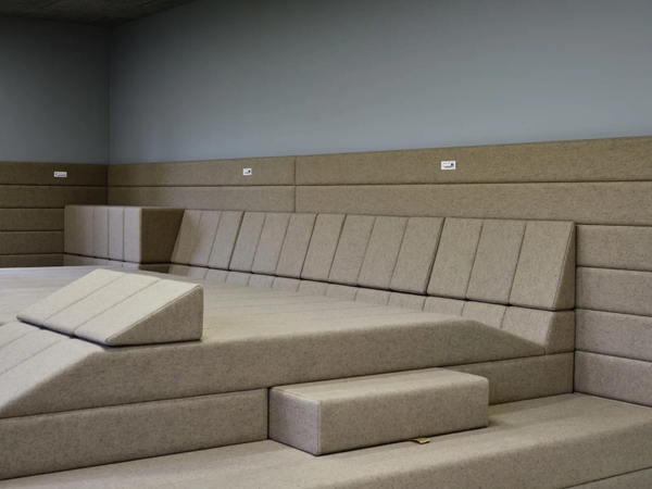 Khu làm việc chính là một không gian mở với bàn dài và vách kính trong suốt chia nhẹ không gian mà không làm mất đi ánh sáng và tầm nhìn. Những băng ghế dài, booth cách âm và góc bếp mở được bố trí quanh một “cảnh quan nỉ” – hệ đệm, gối có thể di chuyển linh hoạt để phục vụ trò chuyện nhóm nhỏ, nghỉ ngơi hay sinh hoạt chung.