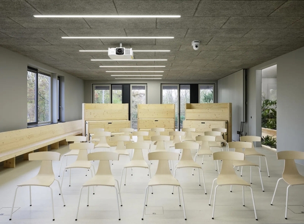 Khán phòng đa năng được trang bị đồ nội thất tùy biến: tủ lưu trữ có thể trở thành bục ngồi, bàn khung kim loại có chân điều chỉnh để biến thành ghế băng. Một vách gập lớn được thiết kế ăn khớp hoàn toàn với kiến trúc nội thất – cho phép không gian thay đổi nhanh chóng theo sự kiện.