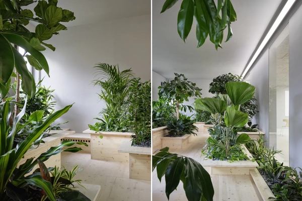 Bên cạnh đó là khu vườn trong nhà – nơi những chậu cây lá lớn không chỉ đóng vai trò trang trí mà còn là ghế ngồi hoặc vùng ngăn cách trực quan. Đây là khoảng lặng giữa văn phòng, nơi lý tưởng để suy ngẫm, tìm kiếm sự tĩnh tại giữa nhịp làm việc sôi động. Trên tầng lửng là chuỗi các phòng nhỏ hơn – yên tĩnh và kín đáo hơn – dành cho những công việc đòi hỏi sự tập trung cao độ.